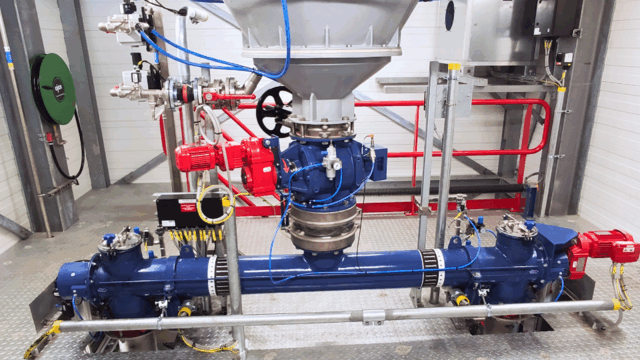 A vortex vessel is mounted underneath the outlet of each LIW feeder. The activated carbon falls into the middle of the vessel, which is internally sprayed with service water during the process. The slurry that is created in this way is sucked in by an ejector and pumped to dosing points on the aeration tanks of the water treatment plant. There, the slurry is mixed with the waste water, after which the activated carbon can get to work.