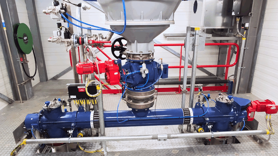 The screw conveyor operates two loss-in-weight (LIW) feeders arranged in parallel. These consist of a storage hopper with a small dosing screw at the bottom. After receiving an 'empty' signal from one of the LIW feeders, the valve automatically discharges activated carbon powder from the silo and into the screw, which then fills the feeder. The rotation speed of the dosing screw is then continuously adjusted by the signal from the feeder's system to achieve the set feed rate.