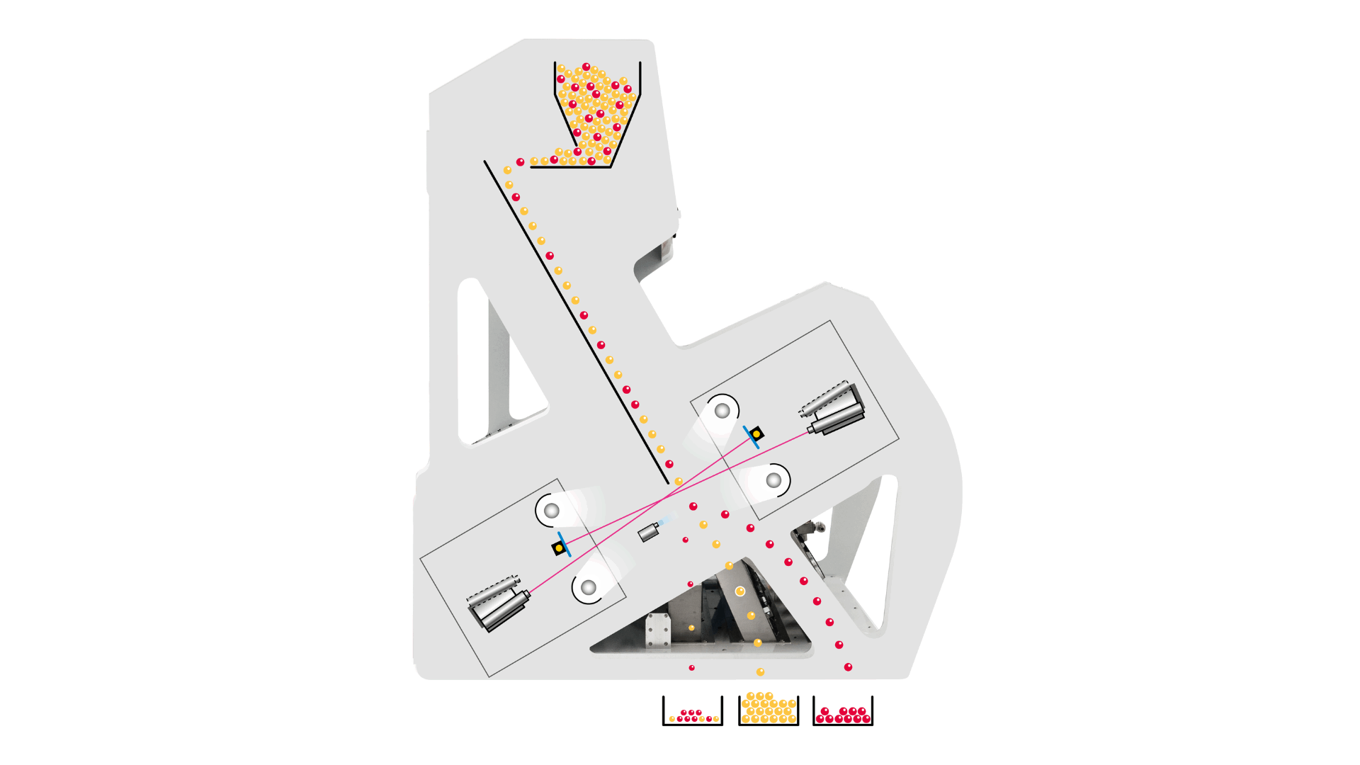 De hogeresolutie full-color en infrarood camera’s garanderen de detectie en verwijdering van alle vreemde voorwerpen, zoals stenen, hout en glas. Ook zorgen ze voor de afscheiding van niet-conforme en ongewenste korrels.