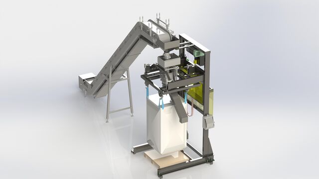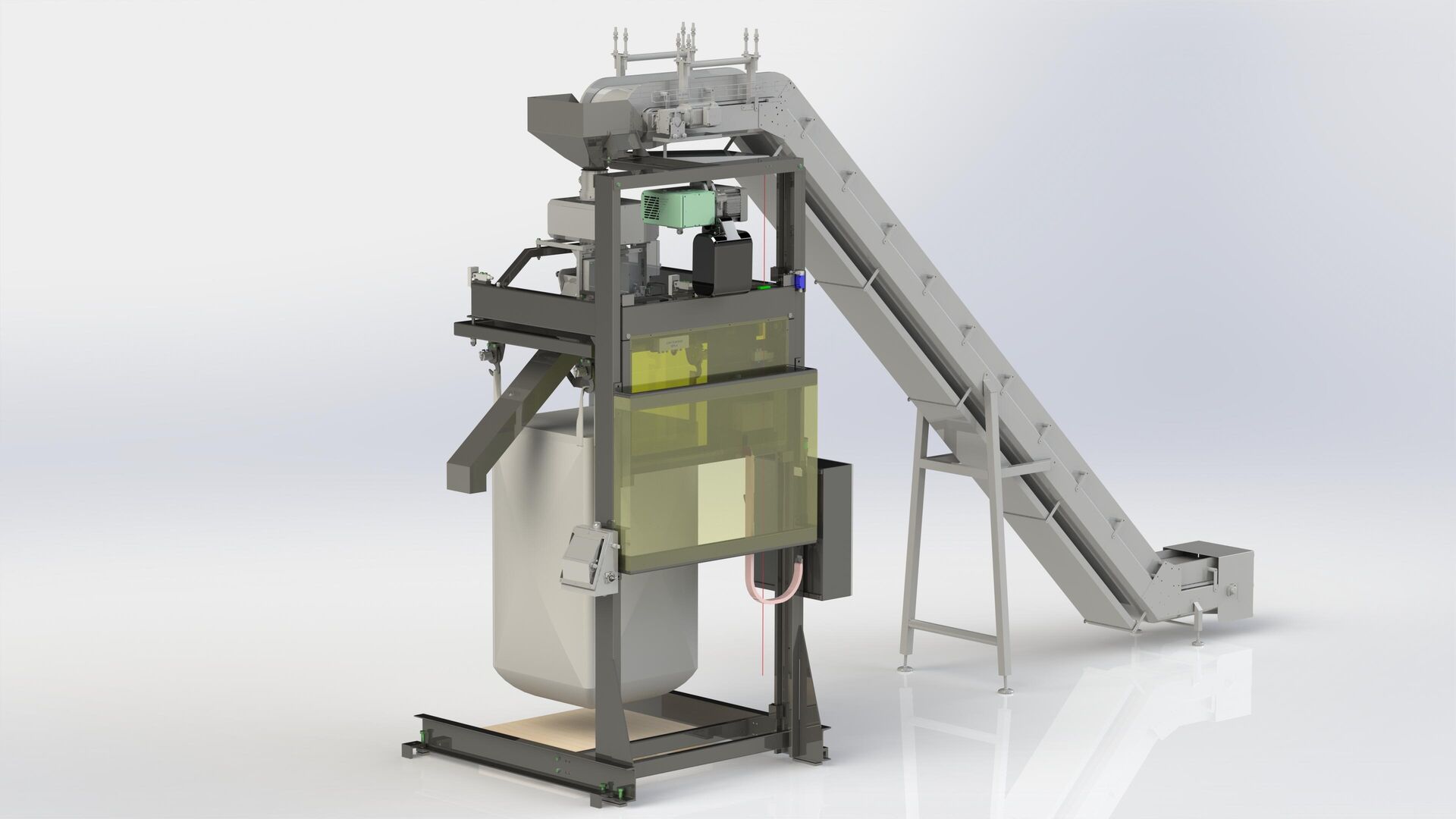 Het vullen van de big-bag wordt gerealiseerd met een schakelbandtransporteur met meenemers. De metaaldetector is bevestigd aan het hef- en weegframe van de vuller en beweegt mee met het op en neer bewegen van het frame. Er werd voor deze oplossing gekozen om kwetsbare buis-in-buisconstructies te vermijden en het vulsysteem compacter te maken. Door de beperkte hoogte van de installatie heeft de afvoerpijp van de detector een wat kleinere storthoek dan gebruikelijk. Deze constructie was mogelijk dankzij de goed stromende eigenschappen van het pepernootproduct. Ook wordt de operator zo niet in zijn handelingen belemmerd. De trechter van de vulbuis loopt wat minder steil dan normaal het geval is. De transportband is afgesteund op poten en aan het plafond. Deze aanpassingen zorgen voor de benodigde ruimtebesparing.