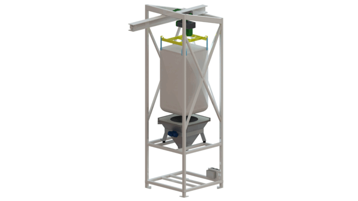 De Gantry big-bag lossystemen met geïntegreerde hijsbalk en kettingtakel zijn ontworpen om lokaal en autonoom te werken. Het systeem bestaat uit een staalconstructie met een hijsinrichting om de zakken op te tillen en te verwerken en kan worden uitgebreid met hulpapparatuur.